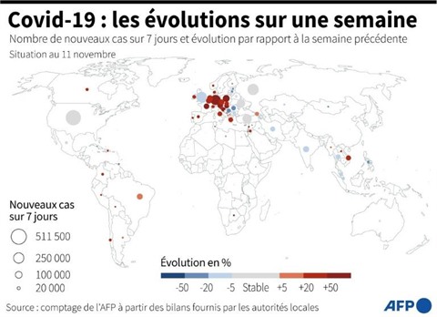 | Nombre de nouveaux cas de COVID-19 recensés sur sept jours et évolution par rapport à la semaine précédente, par pays, au 11 novembre. |