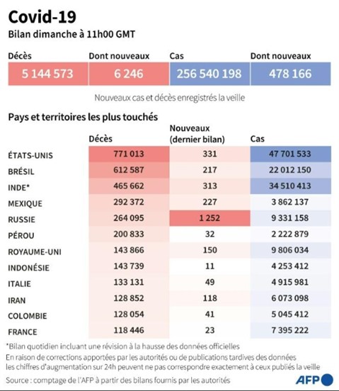 La pandémie du nouveau coronavirus a fait au moins 5.144.573 morts dans le monde depuis fin 2019, selon un bilan établi par l'AFP à partir de sources officielles dimanche 21 novembre en milieu de journée.