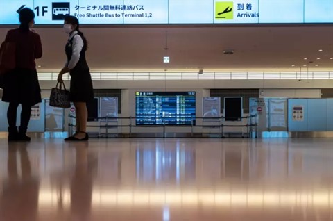 | Du personnel aéroportuaire dans un hall d'arrivée vide à l'aéroport international Haneda de Tokyo, au Japon, le 30 novembre. |