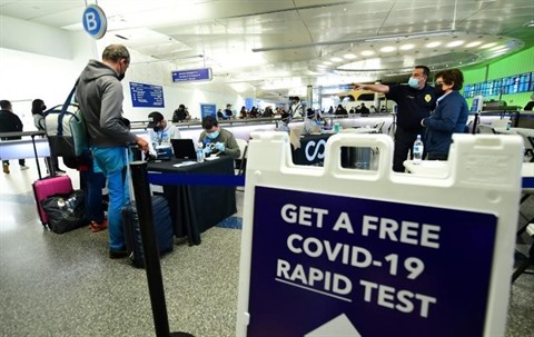 | Un panneau proposant des tests COVID rapides pour les voyageurs arrivant de pays touchés par le nouveau variant Omicron, le 3 décembre. |