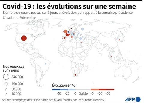 | Nombre de nouveaux cas de COVID-19 recensés sur sept jours et évolution par rapport à la semaine précédente, par pays, au 9 décembre. |