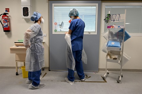 | Des infirmiers revêtent des combinaisons protectrices avant de se rendre auprès d'un malade atteint du COVID dans un hôpital de Marseille en France le 5 janvier. |