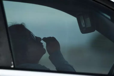 | Un automobiliste effectue un prélèvement pour un test PCR de dépistage du COVID-19 le 10 janvier à Long Beach (États-Unis, Californie). |