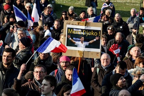 | Un manifestant brandit une pancarte sur laquelle est inscrit "Merci Djoko" lors d'une mobilisation contre le pass vaccinal sur la place du Trocadéro, à Paris, le 15 janvier |