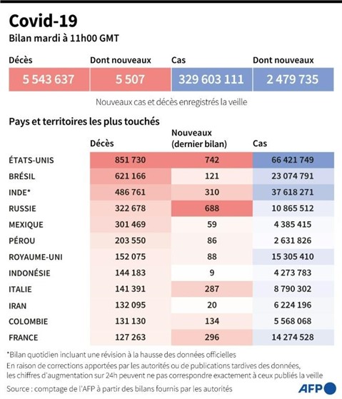 La pandémie de COVID-19 a fait au moins 5.543.637 morts dans le monde depuis fin décembre 2019, selon un bilan établi par l'AFP à partir de sources officielles, mardi 18 janvier à la mi-journée. En valeur absolue, les pays qui ont enregistré le plus de morts sont les États-Unis (851.730), le Brésil (621.166), l'Inde (486.761) et la Russie (322.678).