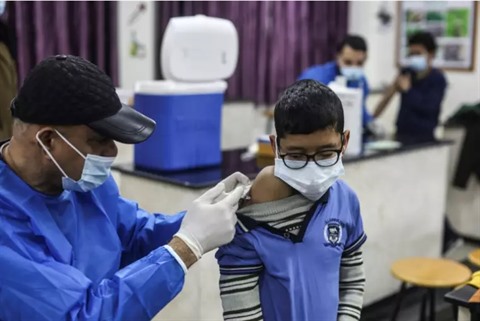 | Un élève palestinien reçoit le vaccin Pfizer-BioNTech contre le COVID-19 à Gaza le 24 janvier. |