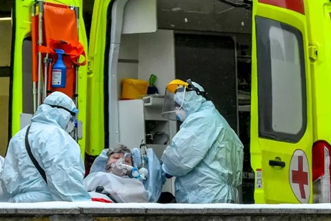 | Un patient malade du COVID-19 arrive à l'hôpital Pokrovskaya, à Saint Petersburg, le 24 janvier. |