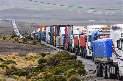 | Des camions sont alignés alors que les conducteurs font la queue pour passer un test de dépistage du COVID-19 sur l'autoroute Patacamya-Tambo Quemado à la frontière avec le Chili, Tambo Quemado, Bolivie, le 23 janvier. |