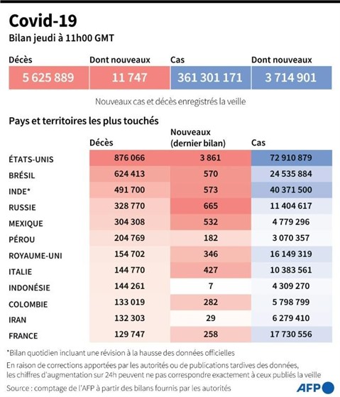 La pandémie de COVID-19 a fait au moins 5.625.889 morts dans le monde depuis fin décembre 2019, selon un bilan établi par l'AFP à partir de sources officielles jeudi 27 janvier. En valeur absolue, les pays qui ont enregistré le plus de morts sont les États-Unis avec 878.325 décès, le Brésil (625.085), l'Inde (491.700) et la Russie (328.770).