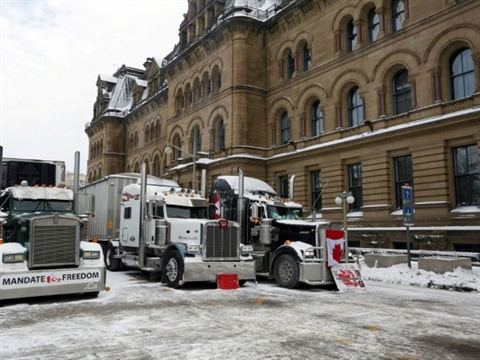| Des camionneurs garés devant le bureau du Premier ministre canadien Justin Trudeau à Ottawa poursuivent leur mouvement de protestation contre les restrictions sanitaires adoptées pour endiguer la propagation du COVID-19, le 4 févrer. Photo : AFP/VNA/CVN |