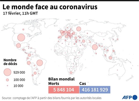 La pandémie a fait officiellement plus de 5.848.104 morts dans le monde depuis fin décembre 2019, selon un bilan établi par l'AFP jeudi 17 février à 11h00 GMT.