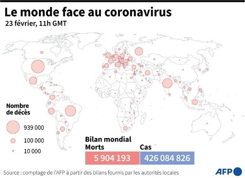 La pandémie a fait officiellement au moins 5.904.193 morts dans le monde depuis fin décembre 2019, selon un bilan à partir de sources officielles mercredi 23 février en milieu de journée.