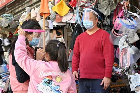 | Une femme achete une visière de protection contre le COVID-19 à Hong Kong, le 25 février 2022. |
