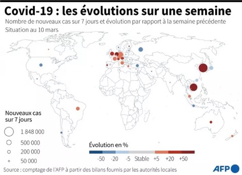 | Nombre de nouveaux cas de COVID-19 recensés sur 7 jours et évolution par rapport à la semaine précédente, par pays, au 10 mars. |