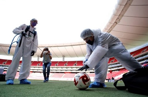 | Désinfection des ballons avant un match de football à Guadalajara, au Mexique, le 12 juillet. |