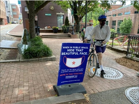 | Un panneau incitant au port du masque, avec l'inscription "Dans l'espace public, cachez ce joli minois", dans le quartier de Georgetown à Washington, le 12 juillet. |