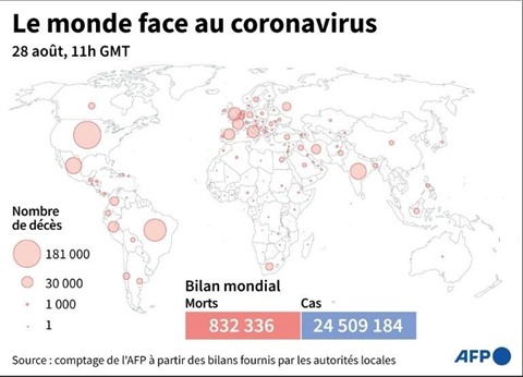 La pandémie a fait plus de 832.000 morts dans le monde depuis l'apparition du virus fin décembre, selon un bilan établi par l'AFP à partir de sources officielles vendredi 28 août en milieu de journée.