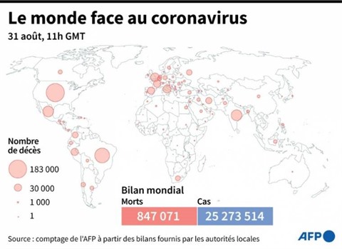 La pandémie du nouveau coronavirus a fait plus de 847.500 morts dans le monde depuis que le bureau de l'OMS en Chine a fait état de l'apparition de la maladie fin décembre, selon un bilan établi par l'AFP à partir de sources officielles lundi 31 août.