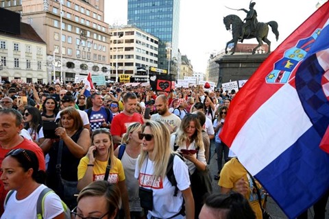 | Plusieurs milliers de personnes manifestent à Zagreb contre le port du masque, le 5 septembre. |