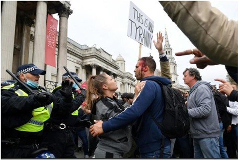 | Manifestation contre les restrictions anti-COVID-19 à Trafalgar Square, à Londres, le 26 septembre. |