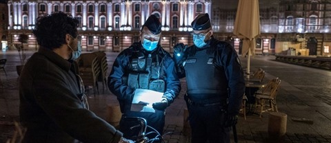 | Deux policiers français contrôlent le respect du couvre-feu à Toulouse, le 24 octobre. |