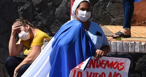 | Des soignants paraguayens manifestent pour demander davantage de moyens dans la lutte contre l'épidémie de coronavirus, à Asuncion, le 19 novembre. |