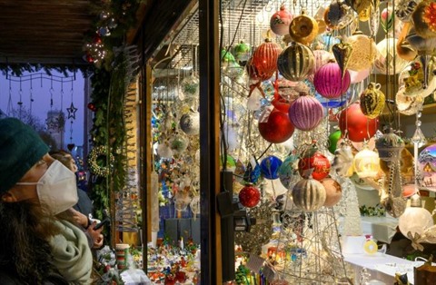 | Une femme portant un masque regarde une vitrine du marché de Noël de Stuttgart (Allemagne) le 30 novembre. |