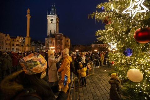 | Des personnes admirent un sapin de Noël illuminé sur la place centrale de Prague, le 29 novembre en République Tchèque. |
