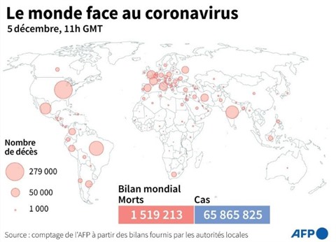 La pandémie du nouveau coronavirus a fait au moins 1.519.213 morts dans le monde depuis fin décembre, selon un bilan établi par l'AFP à partir de sources officielles samedi en milieu de journée. Plus de 65.865.820 cas ont été officiellement diagnostiqués.