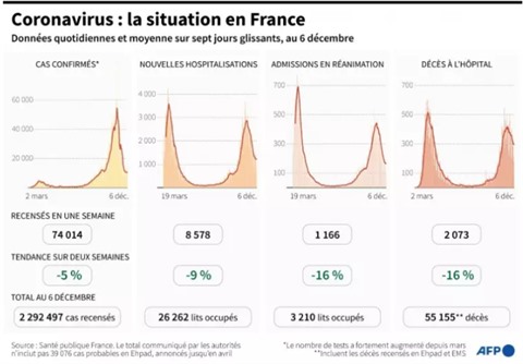 La pandémie a fait plus de 1,53 million de morts dans le monde depuis fin décembre, selon un bilan établi par l'AFP lundi 7 décembre à 11h00 GMT. Quelque 67 millions de cas ont été officiellement comptabilisés, dont plus de 42,6 millions sont guéris.