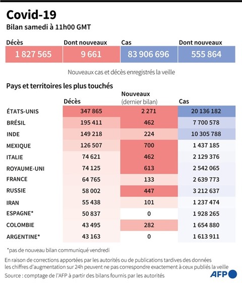 La pandémie a fait au moins 1.827.565 morts dans le monde pour plus de 83,9 millions de personnes contaminées, selon un bilan établi par l'AFP samedi 2 janvier en milieu de journée d'après des chiffres officiels.