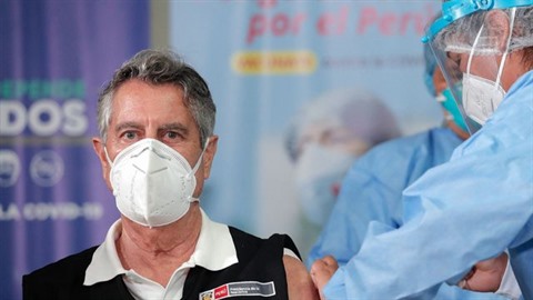 | Le président par intérim du Pérou, Francisco Sagasti, se fait vacciner contre le COVID-19 à Lima, le 9 février. |