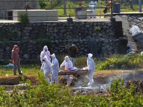 | Des proches transportent le corps d'une personne décédée du COVID-19 dans un crématorium de Siliguri, le 8 mai 2021 en Inde. |
