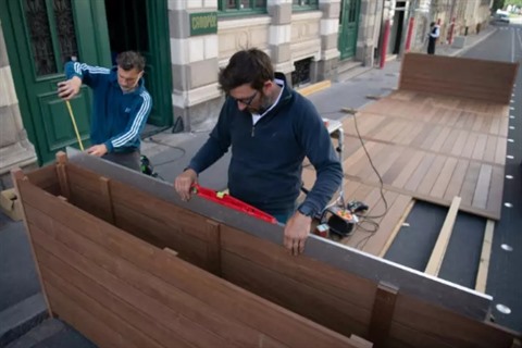 | Des employés d'un café de Nantes construisent le 17 mai une terrasse avant la réouverture des établissements, prévue le 19 mai. |