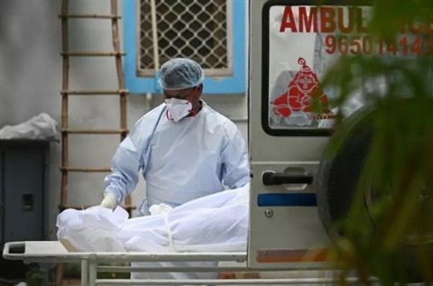 | Le corps d'une personne décédée du COVID-19 est chargé dans une ambulance pour le transporter à la morgue, le 18 mai à New Delhi, en Inde. |