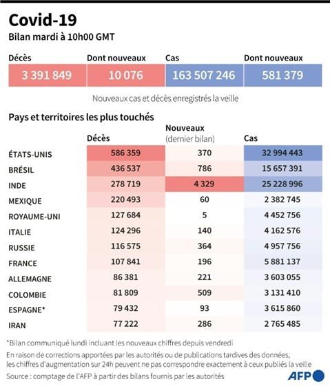 La pandémie a fait au moins 3.391.849 morts dans le monde depuis fin décembre 2019, selon un bilan établi par l'AFP à partir de sources officielles mardi 18 mai à 10h00 GMT.