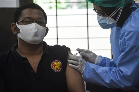 | Un Indonésien vacciné contre le COVID-19 à Jakarta, le 5 mai. |