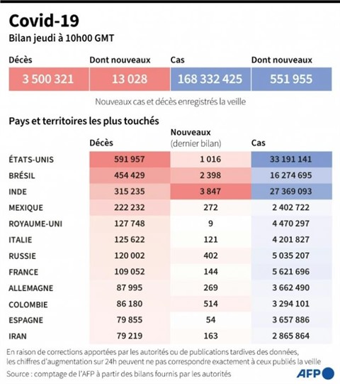La pandémie a fait au moins 3,5 millions de morts dans le monde depuis fin décembre 2019, selon un bilan établi par l'AFP à partir de sources officielles jeudi 27 mai à la mi-journée.