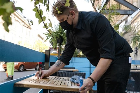| Nicolas Spieckermann, un employé du Burgundy Lion nettoie une table le jour de la réouverture des terrasses au Québec, le 28 mai à Montréal, Canada. |
