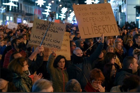 Défilant dans le centre de la ville catalane, les manifestants ont marché derrière une banderole clamant en catalan "Passeport sanitaire = État totalitaire" ou encore "gouvernements et soignants = assassins", a constaté un journaliste de l'AFPTV.
