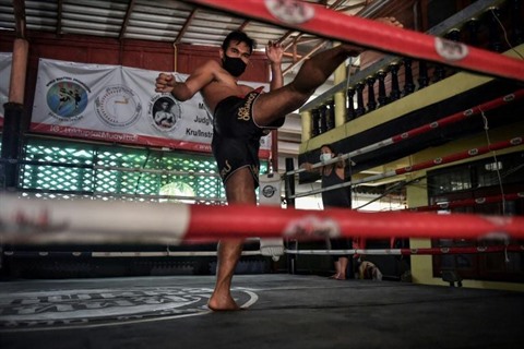 Le boxeur professionnel Pongpisarn Sunyong à l'entraînement avec un masque dans une salle de muay thaï de Bangkok, le 9 avril. Photo : AFP/VNA/CVN |