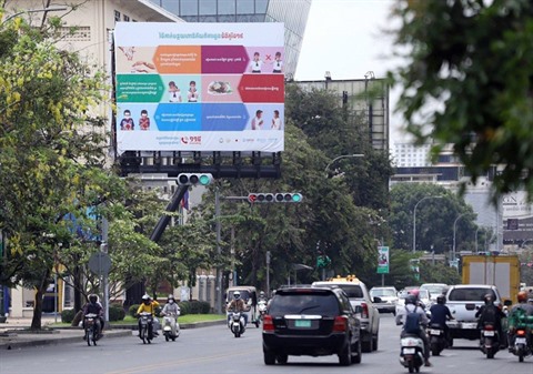 | Un panneau installé dans une rue au Cambodge pour informer les habitants des mesures préventives contre |
