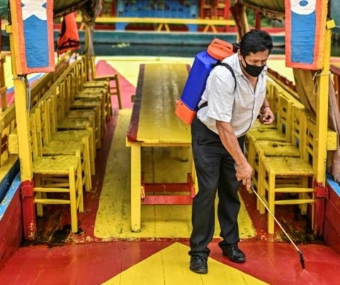 | Opération de désinfection aux jardins flottants de Xochimilco, l'une des principales attractions touristiques de Mexico, lors de leur réouverture, le 21 août 2020. |