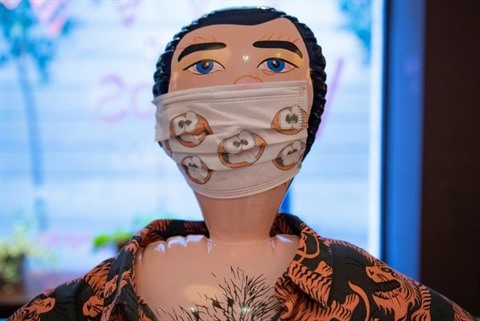 | Une poupée gonflable arborant un masque de protection au bar du restaurant "La Pepita" à Barcelone, le 21 août 2020. |