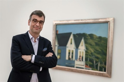 | Ulf Küster, commissaire de l'exposition à la Fondation Beyeler, devant le tableau "Second Story Sunlight" du peintre américain Edward Hopper, le 15 mai à Riehen, près de Bâle, lors de la réouverture des musées en Suisse. |