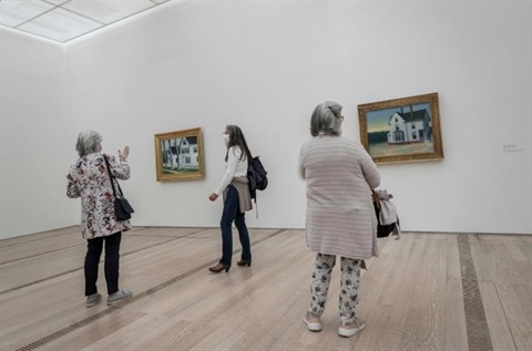 | Des visiteuses contemplent les tableaux "Two Puritans" (gauche) et "Cape Cod Sunset" du peintre américain Edward Hopper, le 15 mai à la Fondation Beyeler à Riehen, près de Bâle, lors de la réouverture des musées en Suisse. |