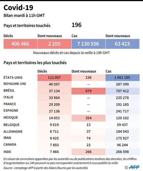 Au Brésil (38.406 morts), troisième pays le plus endeuillé au monde après les États-Unis (111.750) et le Royaume-Uni, le gouverneur de Rio de Janeiro a annoncé l'assouplissement des restrictions. Au Royaume-Uni, le déconfinement se fait au compte-gouttes. Toute personne arrivant dans le pays de l'étranger doit observer une quarantaine de 14 jours, une mesure à l'efficacité contestée qui affole les secteurs aérien et du tourisme.