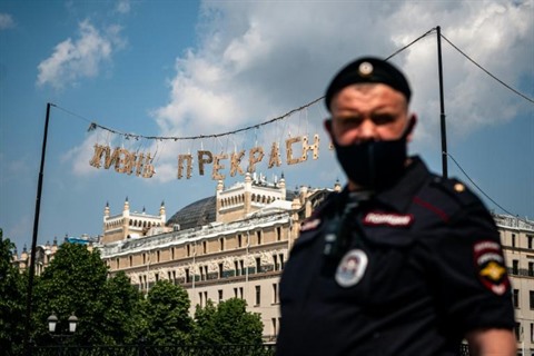 | Un policier russe masqué pose sous une banderolle qui proclame "La vie est belle", dans le centre de Moscou, le 9 juin. |