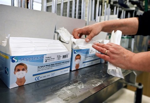 | Un salarié emballe des masques de protection respiratoire dans l'usine Valmy, à Mably (Loire), le 28 février. |