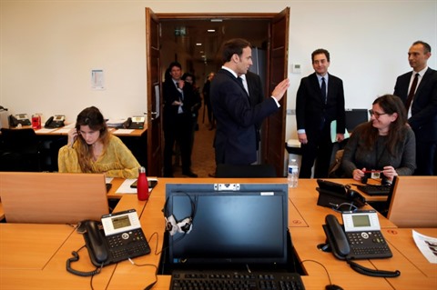 | Le président Emmanuel Macron visite le 3 avril le Centre de crise et de soutien du ministère des Affaires étrangères à Paris. |